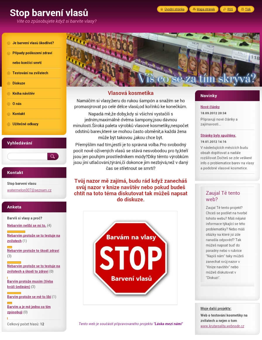 Stop barvení vlasů: na těchto stránkách se věnuji problematice nejen vlasové kosmetiky a jejího vlivu na lidské zdraví a životní prostředí kolem nás... Kliknutím na náhled vstoupíš na stránky.